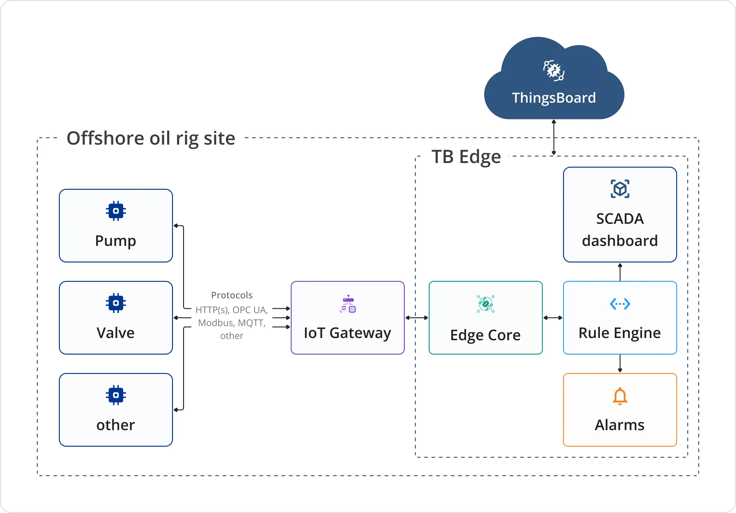 - The ThingsBoard Edge system is responsible for processing the incoming data. For clarity, we can highlight two main parts: the Edge Core to interact with the platform for tasks such as managing devices, telemetry data, and assets; and the Rule Engine, which facilitates custom event-based workflows.