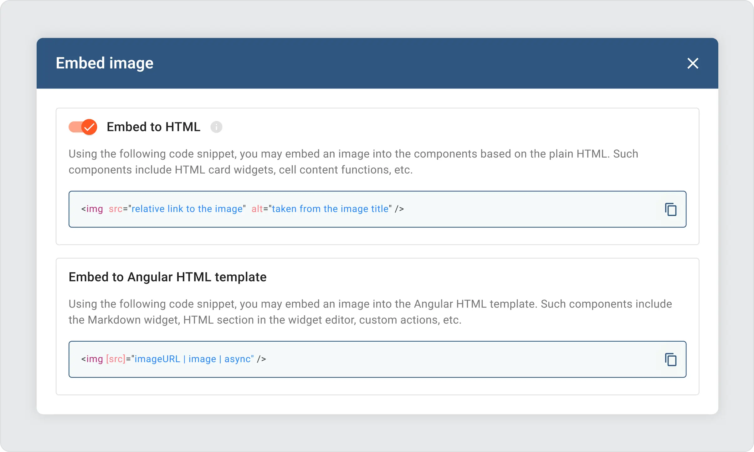 However, custom widgets or static HTML blocks that do not support Angular HTML syntax cannot add authentication headers to requests. Therefore, every platform image also has a unique URL for downloading the image without authentication. Using the following code snippet, you may embed an image into the components based on the plain HTML. Such components include HTML card widgets, cell content functions, etc.
