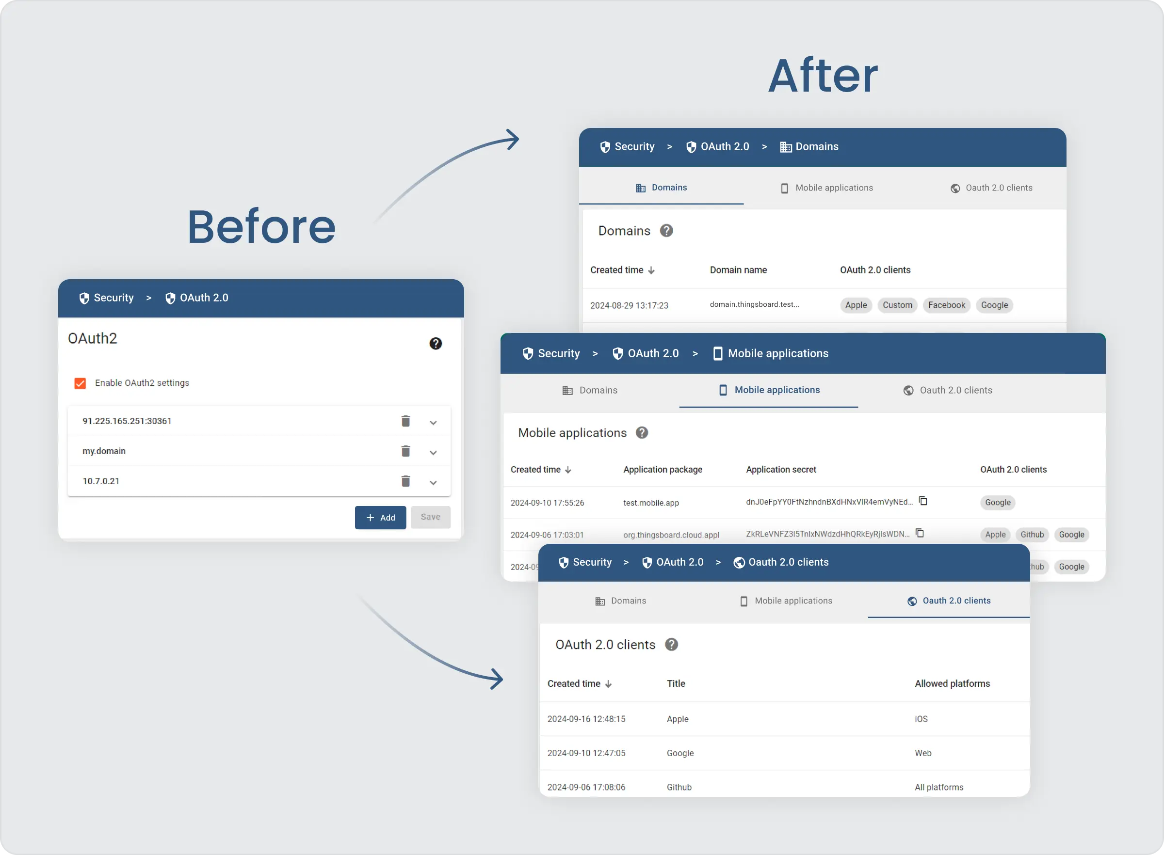 We’ve made significant improvements to the Web UI of the OAuth2 system to enhance the overall user experience. With these updates, domains, mobile applications, and OAuth2 clients are now treated as distinct entity types, allowing for separate and more streamlined configurations. Additionally, the new update enables the reusability of previously created OAuth2 clients for new domains and mobile applications, simplifying the setup of new sign in options.