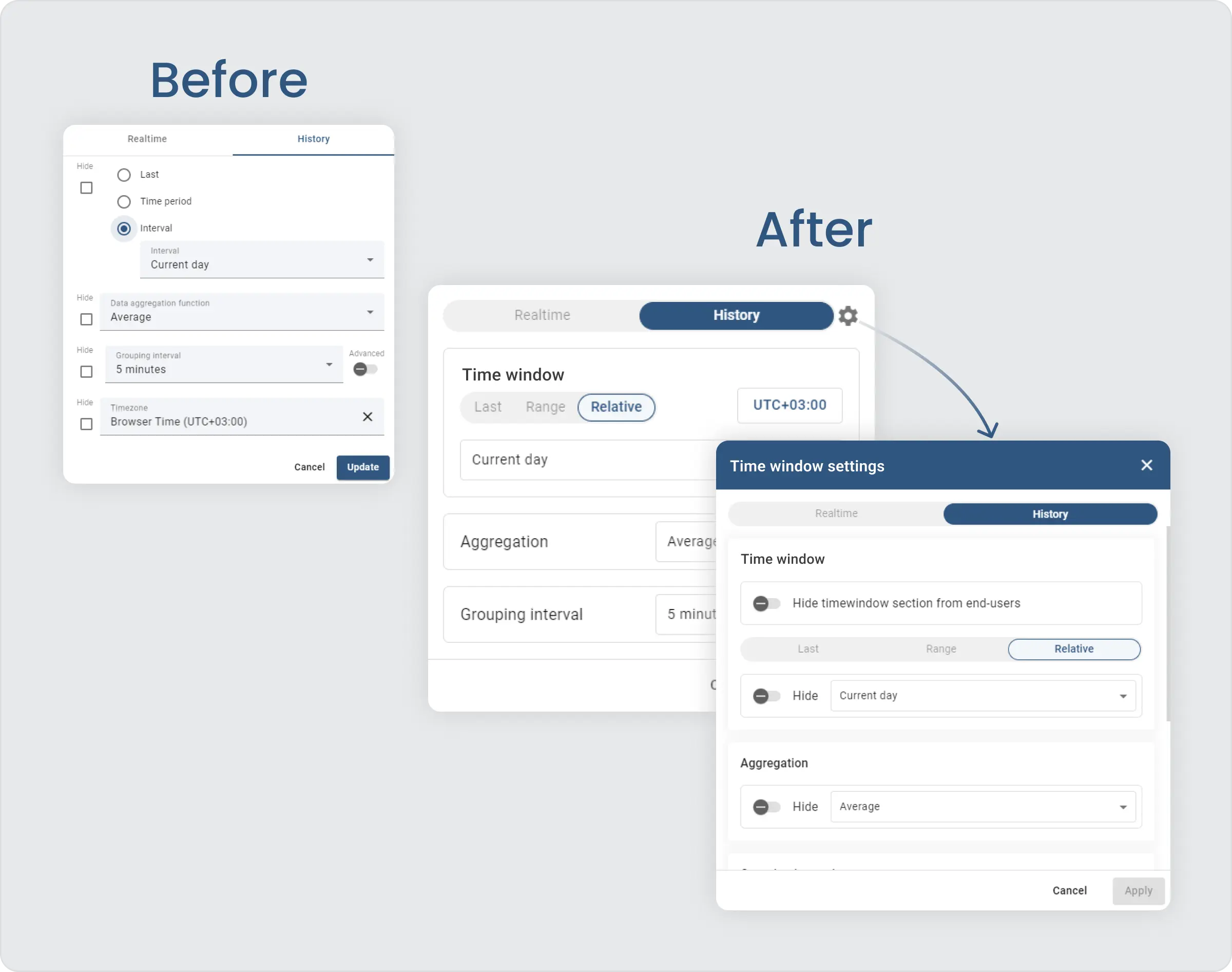 In this update, we’ve enhanced the appearance of the Time window component. Additionally, the visibility settings for the History tab have been expanded, so you can now hide the Last, Range, or Relative sections separately.