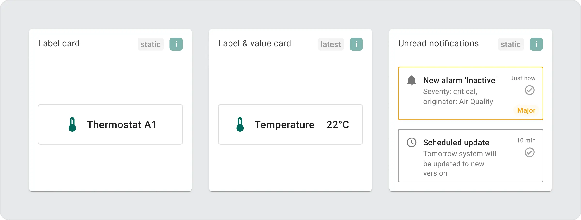 We’ve improved our platform with the new card widgets: the Label card for adding custom static labels and the Label & value card for visualization of time series data or attributes. Additionally, we’ve introduced a new Unread notifications widget, which conveniently displays all notifications right away on your dashboard. This comes in handy when you want to display all data on one page or use the ThingsBoard platform only from the dashboard’s full-screen mode.