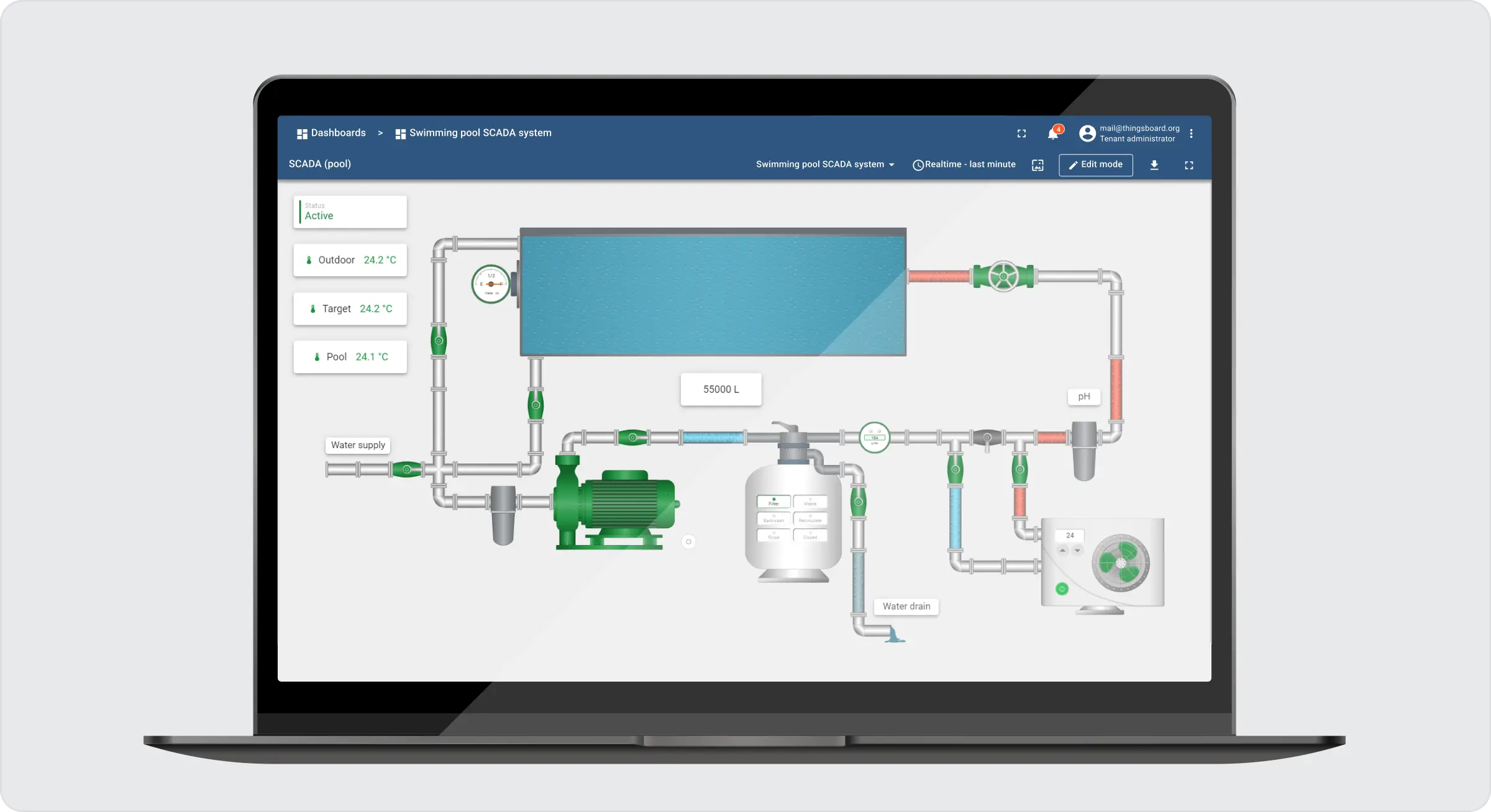 A SCADA dashboard within ThingsBoard offers all the typical platform dashboard functionalities with a specialized SCADA layout designed to ease the creation of SCADA HMIs (Human-Machine Interfaces). It typically includes unique scalable widgets called SCADA symbols. Each symbol can represent the state of a physical object, such as a valve, pump, motor, tank, or pipe. On ThingsBoard, these symbols are based on SVG (Scalable Vector Graphics) files, ensuring they adjust seamlessly to any screen size. In this update, we’ve also introduced the opportunity to easily create your custom symbols using SVG files.